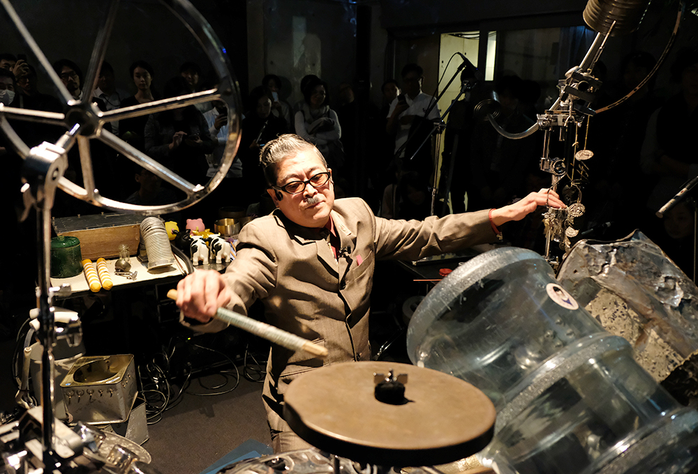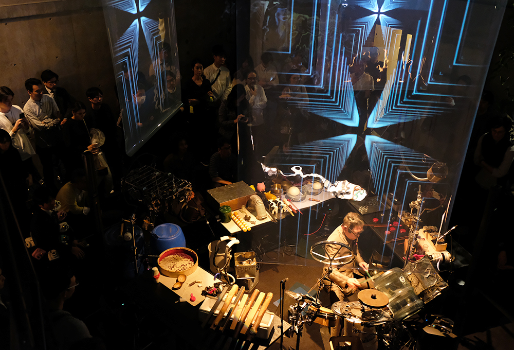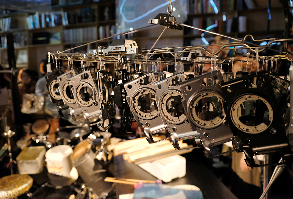 パフォーマンスのテーマは「2049年の荒廃した東京」。空き缶やバケツ、パイプ、材木の切れ端などの廃品やガラクタが奏でる、どことなく不思議でもの悲しい、時にはクスッと笑えるパフォーマンスに、来場者は魅了されました。FUJIFILM designのカメラ部材や化粧品の容器なども楽器として使われ、ユニークな音づくりに一役買いました。