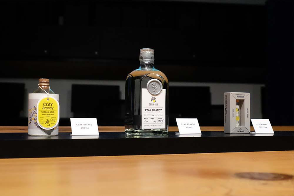1階では、蒸留酒・ソーダのボトルデザインと、メイキングムービーを展示しました。蒸留酒のボトルは500mlと100mlの2種を用意。前者は、シンプルなデザインの中に手押しのホットスタンプを施したこだわりの仕様にしました。後者は、来場者へ配るお土産として、湘南ゴールドの樹木の写真を配した情緒豊かなデザインに仕上げ、ボトルネックに掛けたタグでは美味しい飲み方をイラストで紹介しています。