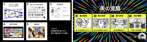 テーマ1「美の活動」は、コンシューマプロダクトグループによるアウトプットの向上を目的とした活動です。普段の対象製品にこだわらず、自分が美しいと思うモノを持ち寄るなどして語り合うことで、1人のデザイン好きとして世代を問わず素直な意見交換を行いました。これらを通して自分になかった価値観を得られたり、お互いの理解が深まるなど、デザイン業務に活かせる新たな視点を得ることができました。楽しみながら語り合うという活動の趣旨を体現したユーモアあふれるプレゼンにより会場は笑いに包まれました。